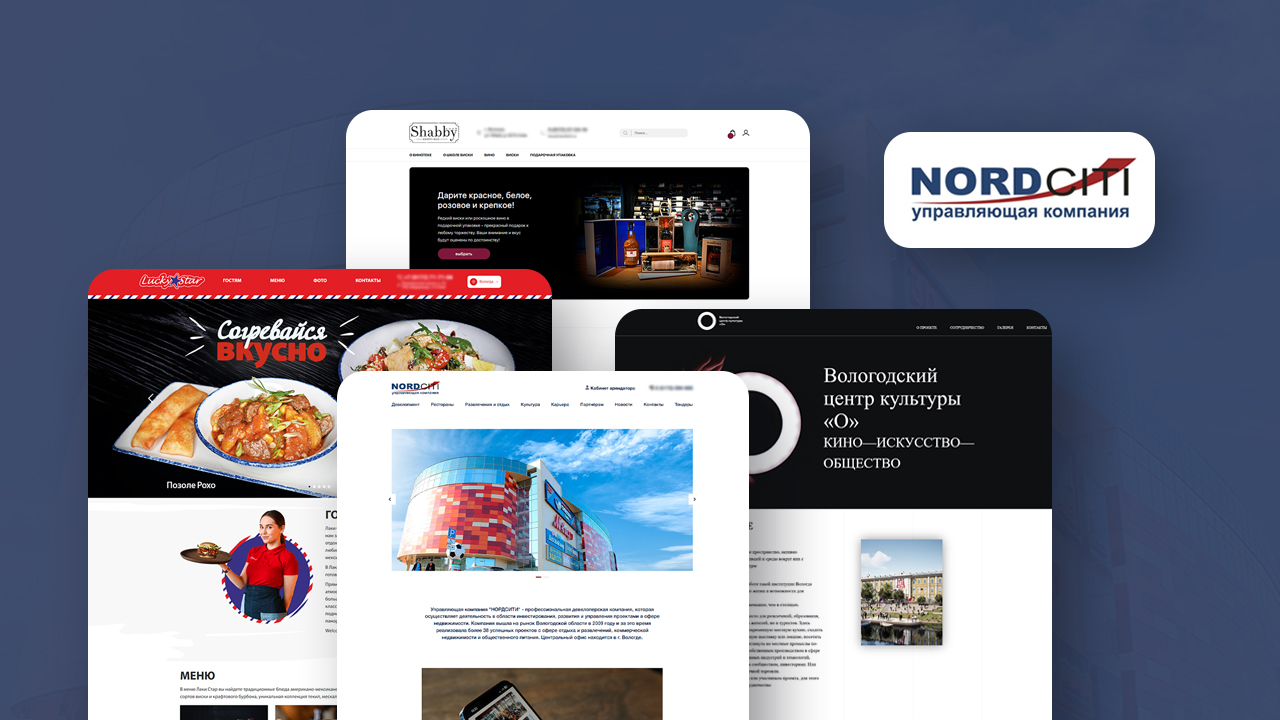 Разработано 4 сайта: интернет-магазин вина и виски для ресторана Shabby, корпоративный сайт для вологодского центра культуры «О», для ресторана Lucky Star и управляющей компании NORDCITI.