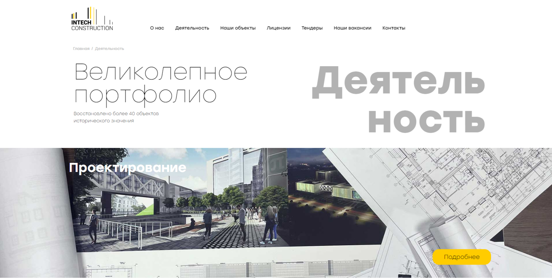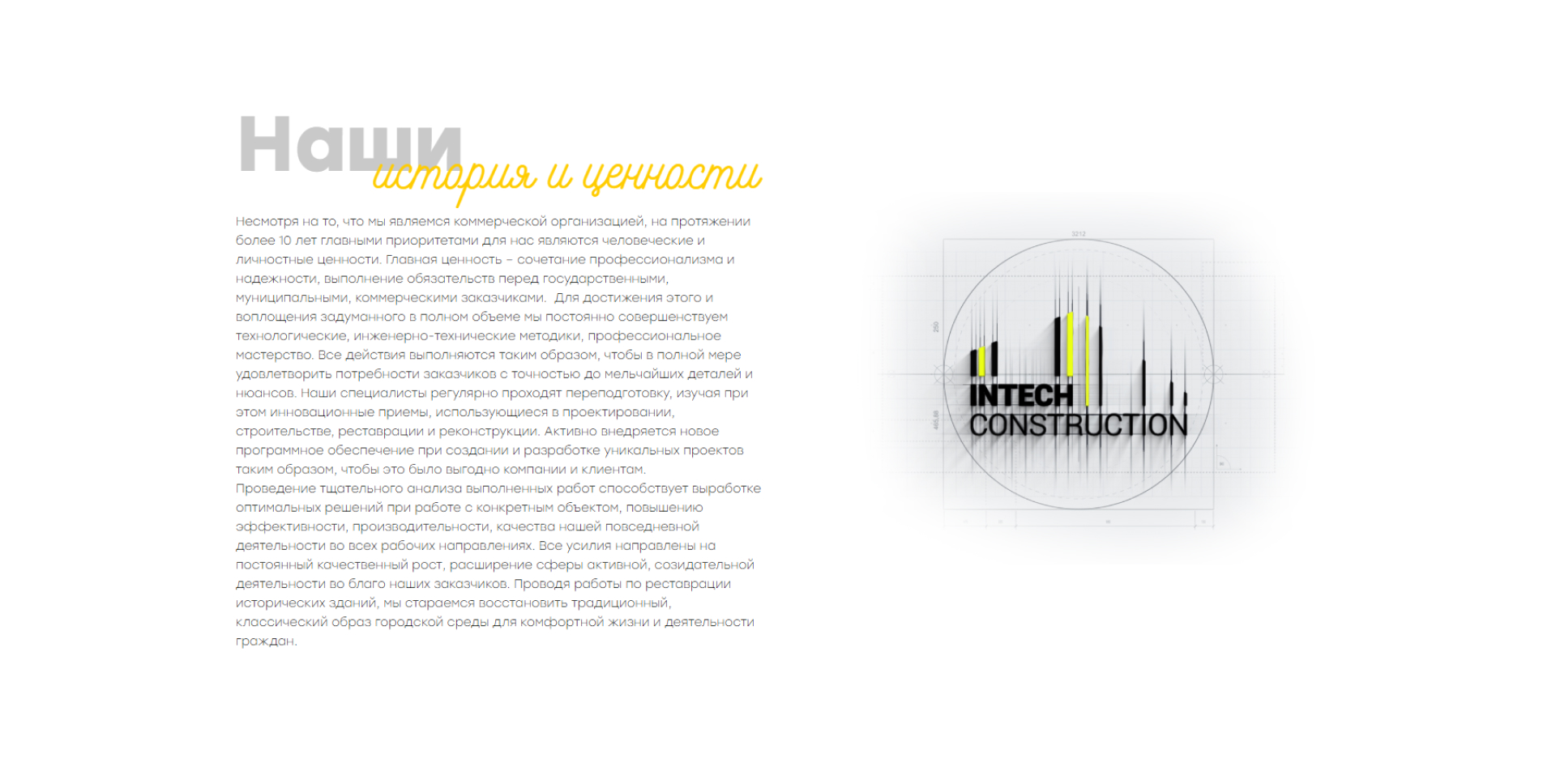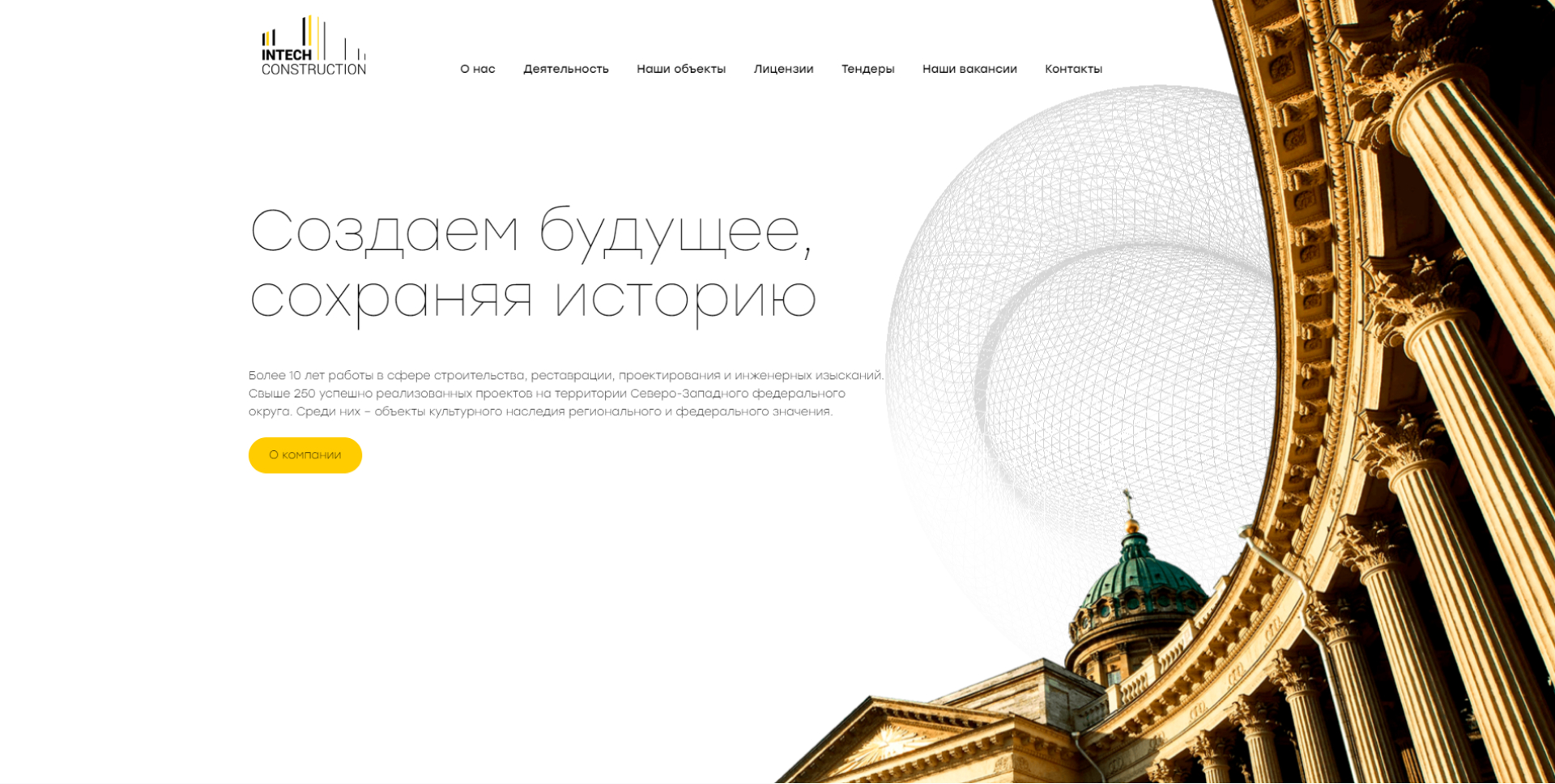 Весной 2021 команда ИНТЕХ Констракшн обратилась к нам с задачей собрать новый сайт. Компания занимается реставрацией и строительством объектов различного назначения. На берегу мы получили основное пожелание “Современно, минималистично” и приступили к работе.