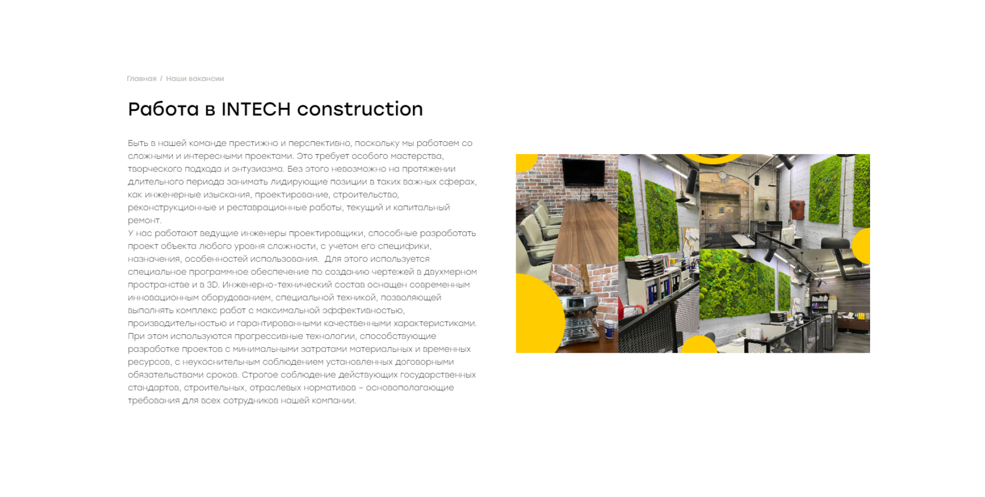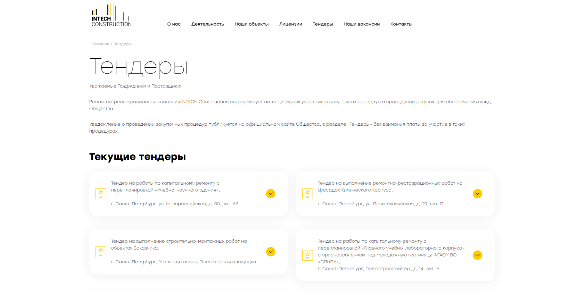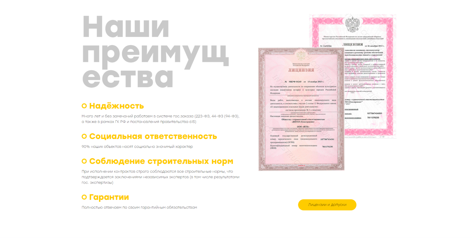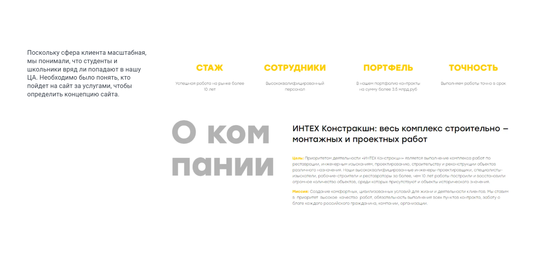 Весной 2021 команда ИНТЕХ Констракшн обратилась к нам с задачей собрать новый сайт. Компания занимается реставрацией и строительством объектов различного назначения. На берегу мы получили основное пожелание “Современно, минималистично” и приступили к работе.