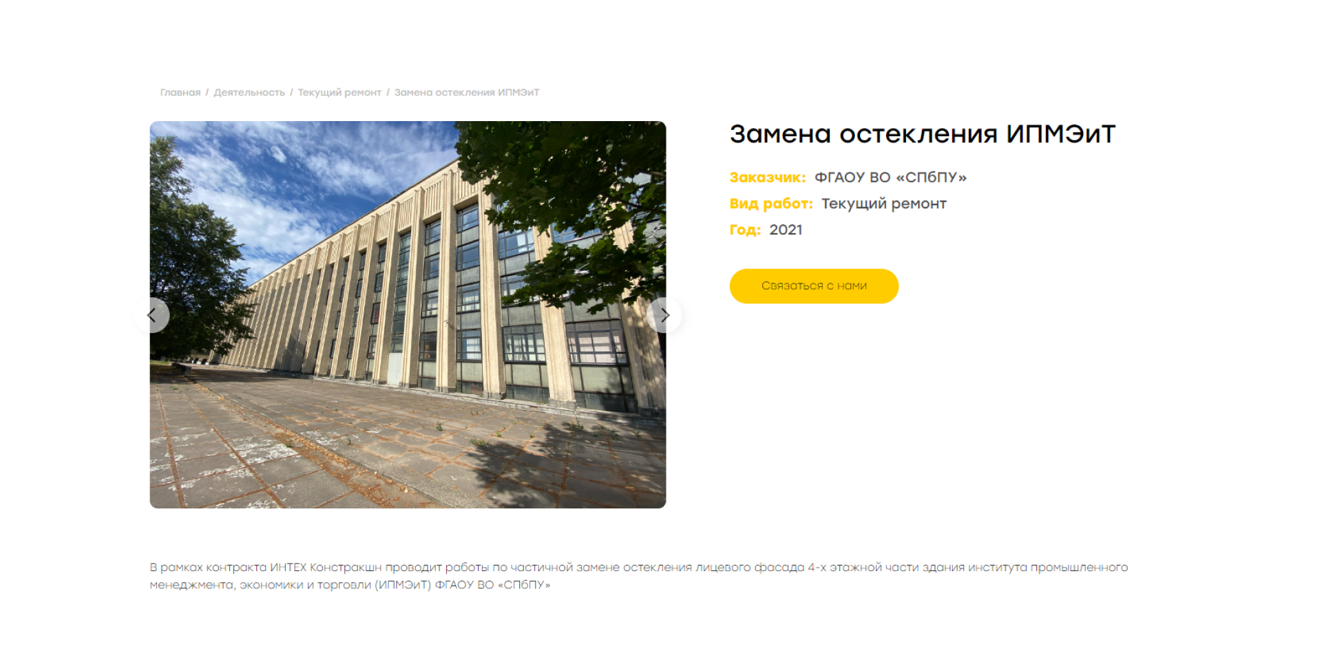 Эффективно продать свои услуги можно лишь в том случае, если известны потребности заказчика. Компания ИНТЕХ Констракшн берется за проекты любой сложности. От капитального ремонта общежития до реконструкции исторических объектов.